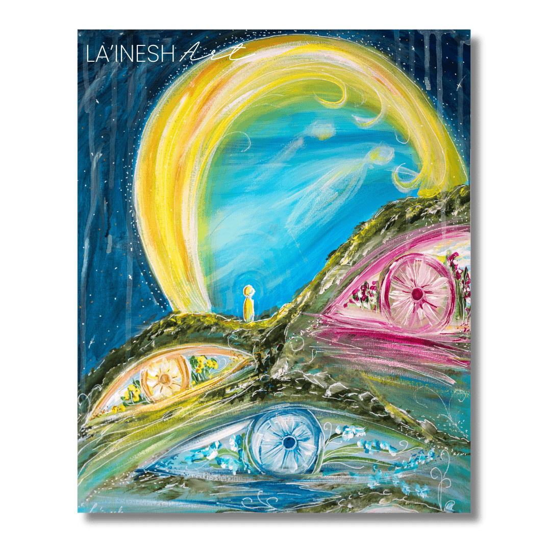 Er ist beschützt durch sein riesiges Herz und doch hat er keine Grenzen. Er sieht diese riesige bunte Welt, die er erschaffen hat, erfreut sich an der Vielfalt, möchte spielen, tanzen, singen, möchte gesehen und gewürdigt werden. Er ist entspannt, gelassen, neugierig und im inneren Kern seiner Seele angekommen. Er spürt die Schöpferkraft in sich, den Boden, die Liebe und weiß, er ist mit allem eins. Und er lacht vor überquellender Freude… Ich bin Dir sehr dankbar, Nadine, dass Du all Dieses erfühlt hast und in einem wilden, bunten, anrührenden und liebevollem Ausdruck auf die Leinwand gebracht hast.“